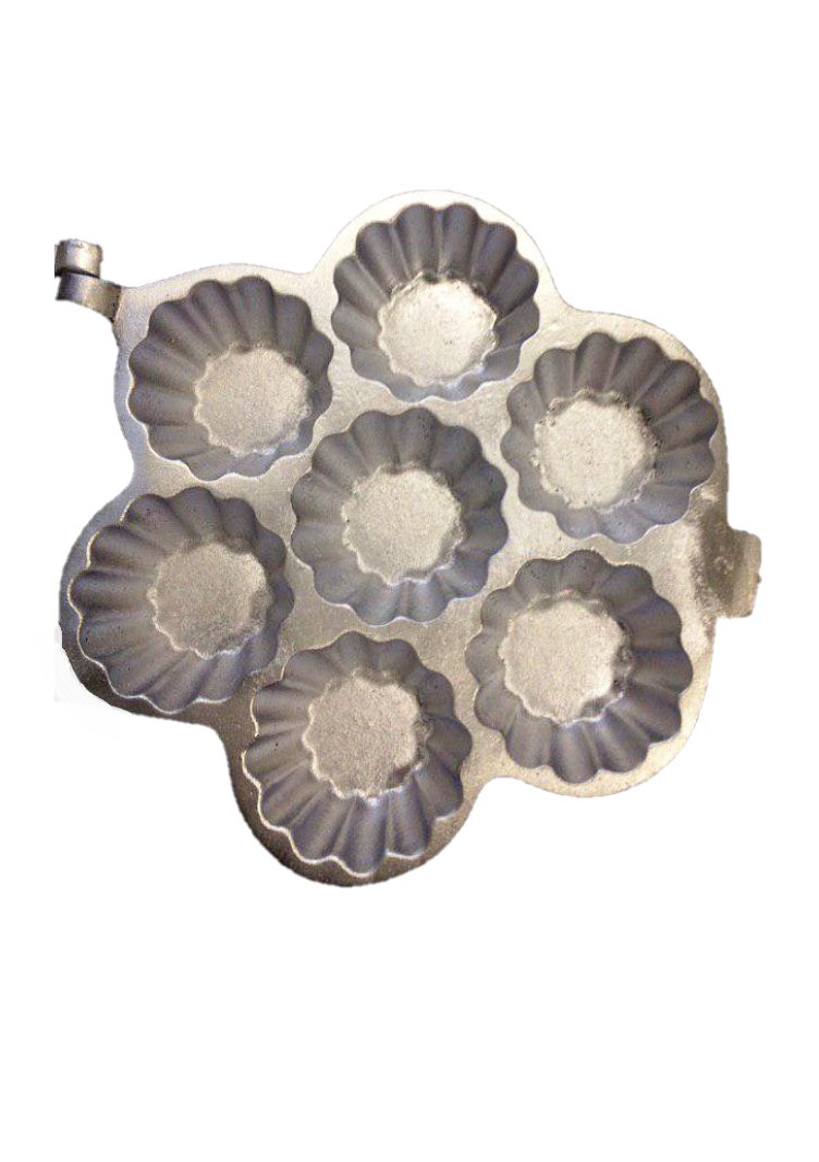 Форма з харчового алюмінію на 7-ми осередках обладнана дерев'яними ручками для зручної випічки на відкритому вогні.